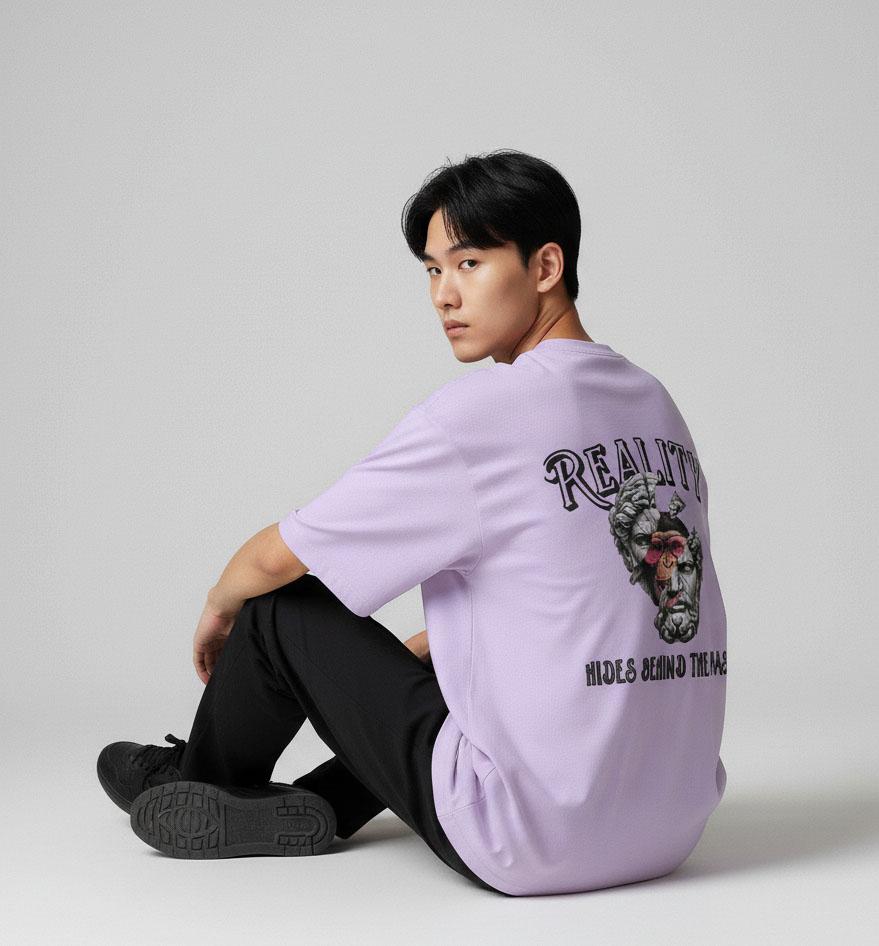 This lavender oversized T-shirt carries a unique “Reality Hides Behind The Mask” design that combines artistic detailing with modern street style.